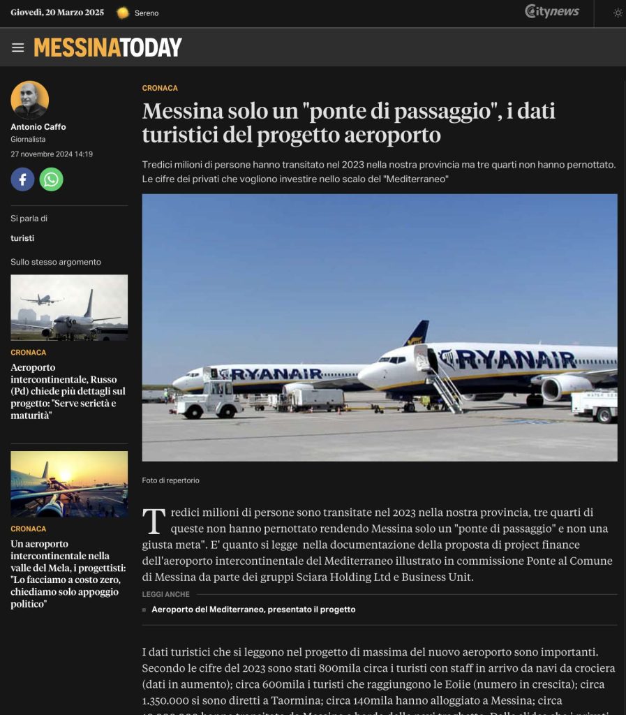 Thirteen million people passed through our province in 2023, but three-quarters of them did not stay overnight, making Messina merely a “passage bridge” rather than a real destination. This is revealed in the documentation of the project financing proposal for the Mediterranean Intercontinental Airport, presented to the Bridge Commission of the Messina City Council by the Sciara Holding Ltd and Business Unit groups.